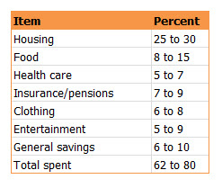 Below is a short table you can use as a guide to determine what percentage of your income should be spent on some of your other basic necessities. These percentages will vary depending on your individual needs. One of the challenges with renting is finding living accommodations that costs no more than 30 percent of your income. Shopping around and possibly getting a roommate to share the rental costs can be a viable option if you’re having trouble finding housing that meets both your desires and your budget.